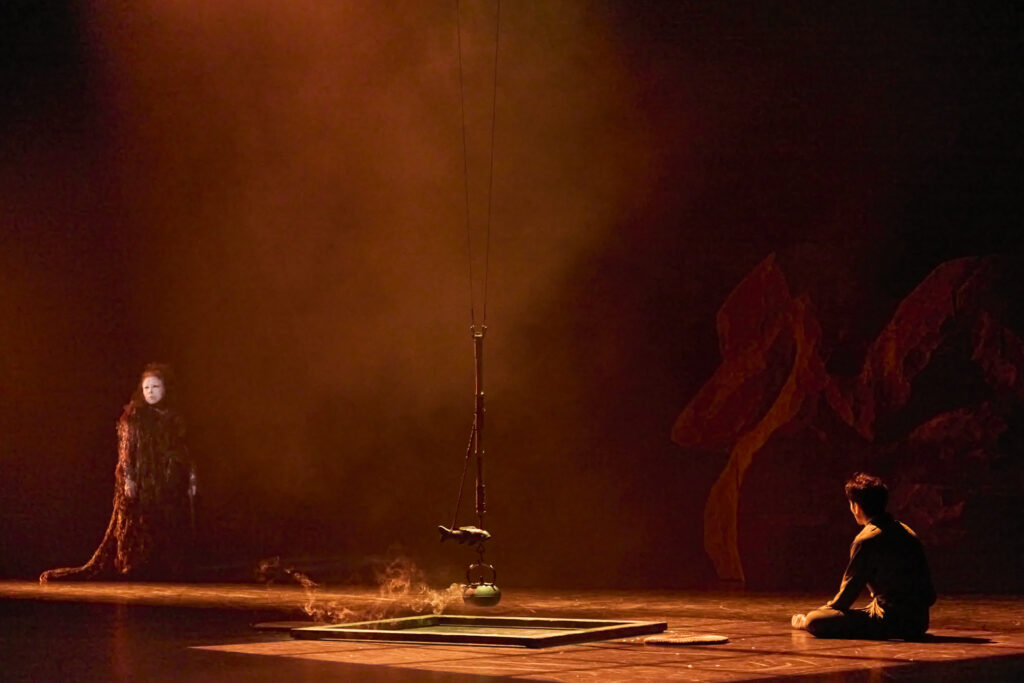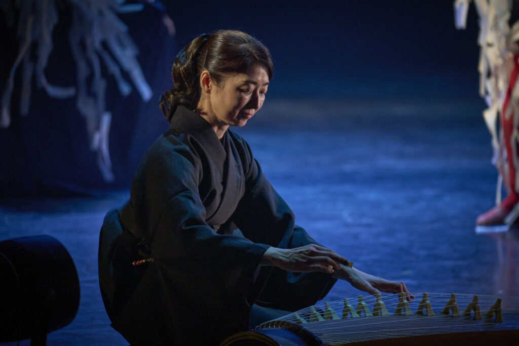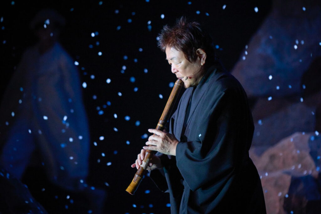 特に注目すべきは、尺八の音が、旋律よりも先に息の存在を観客に意識させる点である。音は常に呼吸と不可分であり、そのため、舞台空間には「誰かがそこにいる」「何かが息づいている」という感覚が、言葉を介さずに立ち上がる。これは、遠野物語に頻出する、人と異界との境界が曖昧な感覚と深く共鳴している。