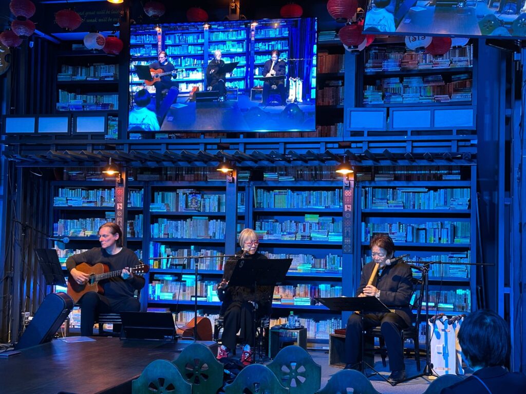 小林氏の声は演奏に人間味を加え、ドナヒュー氏のギターは西洋的な響きをもたらし、音は東洋と西洋の音世界の間を滑るように移動した。